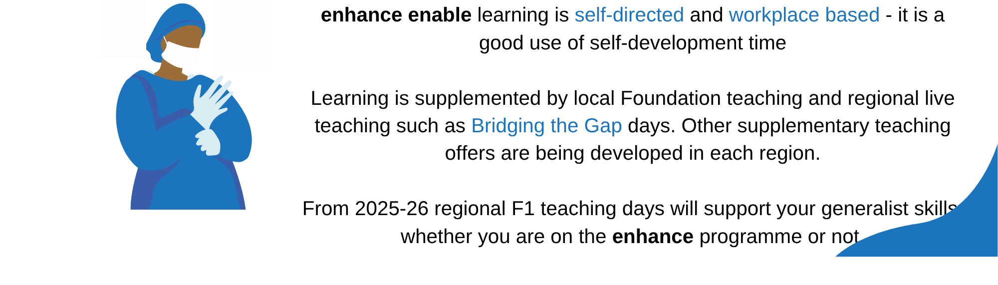 Enhancing Generalist Skills is in the new Foundation curriculum (expected 2026) and the Foundation School has therefore introduced a regional teaching day to introduce the concepts for all Foundation trainees, and to support your education using Enhance as a vehicle for delivering core Foundation learning. You should each be allocated to one mandatory training day across 2025-26; as with all regional Foundation teaching this face to face session may take place in a Trust away from your base.