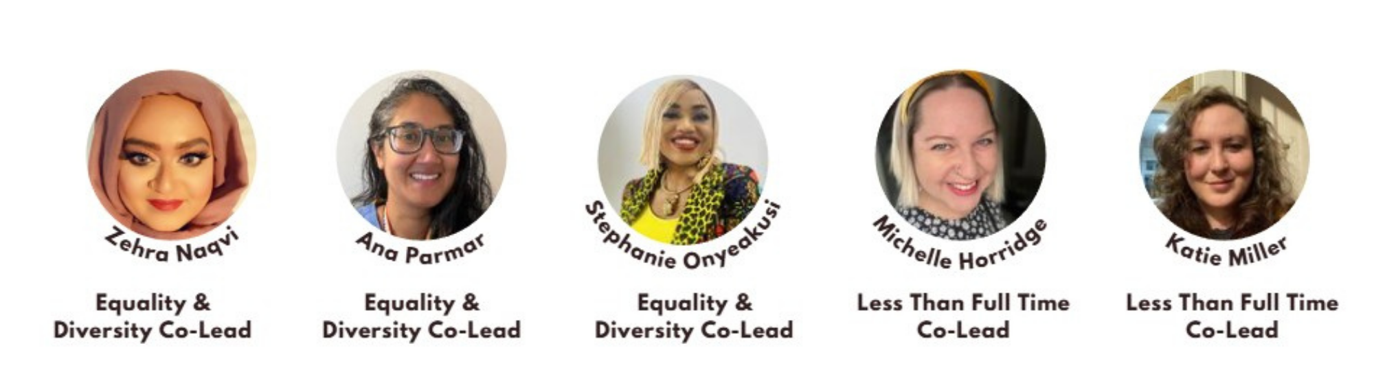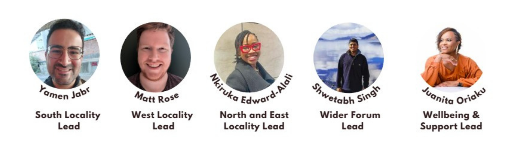 Current roles include chair, vice chair, secretary, wider forum lead, quality lead, wellbeing and support lead, employers lead, locality lead (East, South, West), equality diversity and inclusion lead, less than full time lead and communications and engagement lead.