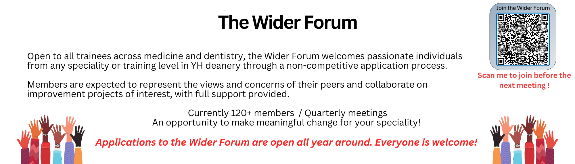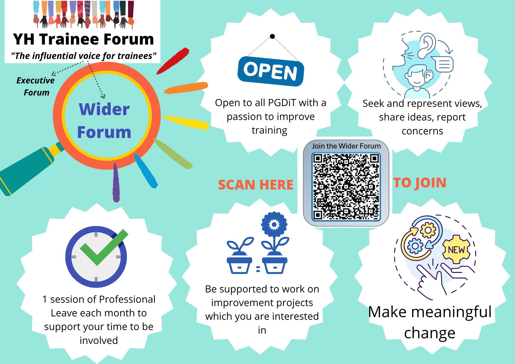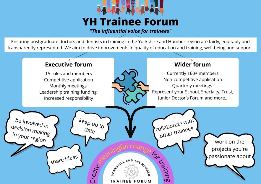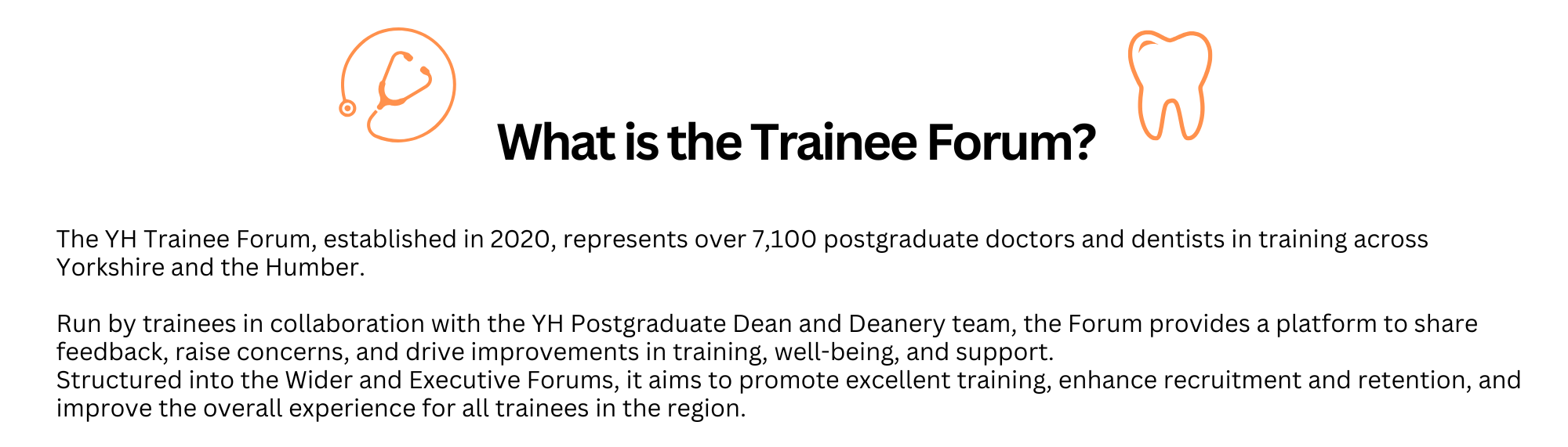 The YH Trainee Forum was created in 2020 and provides a platform for all postgraduate doctors and dentists in training in the Yorkshire and Humber region to offer feedback, share ideas for ways to improve training, and raise any concerns regarding the quality of their education, training and experience in the region.