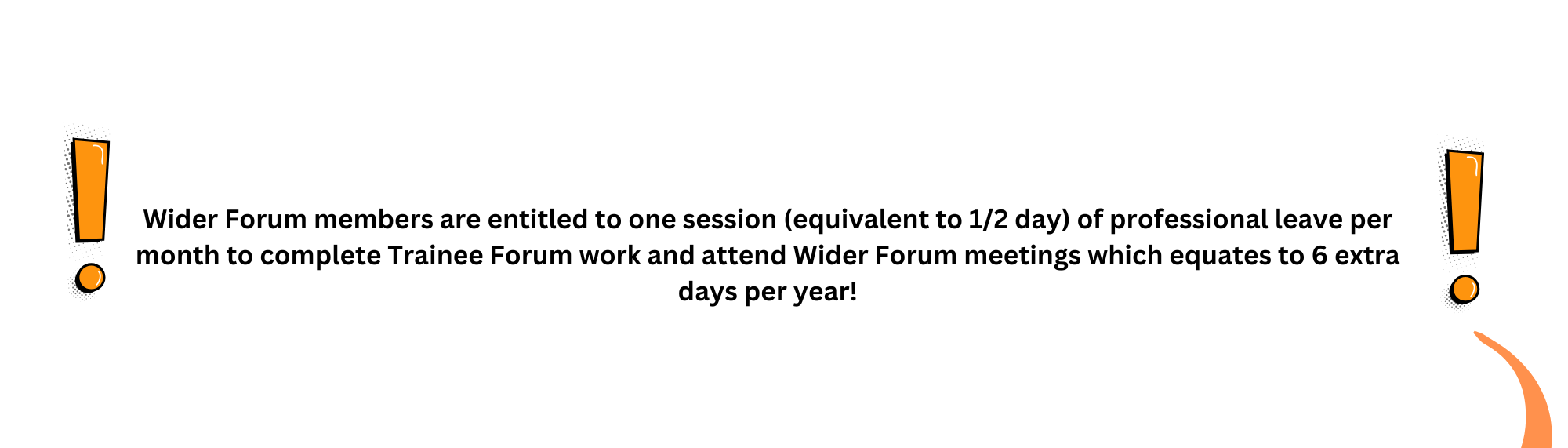 Wider Forum members are entitled to one session (equivalent to 1/2 day) of professional leave per month to complete Trainee Forum work and attend Wider Forum meetings.
