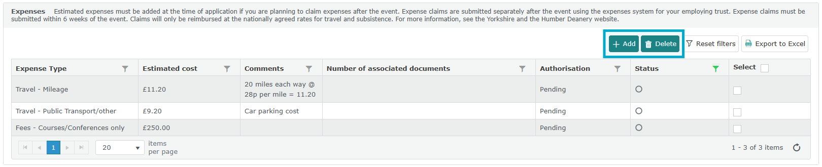 To add an estimated expense, click Add in the Expenses section and follow the instructions below. Each expense must be added seperately by type. Unclear or incorrectly entered expenses may result in your application or expense claim being rejected.